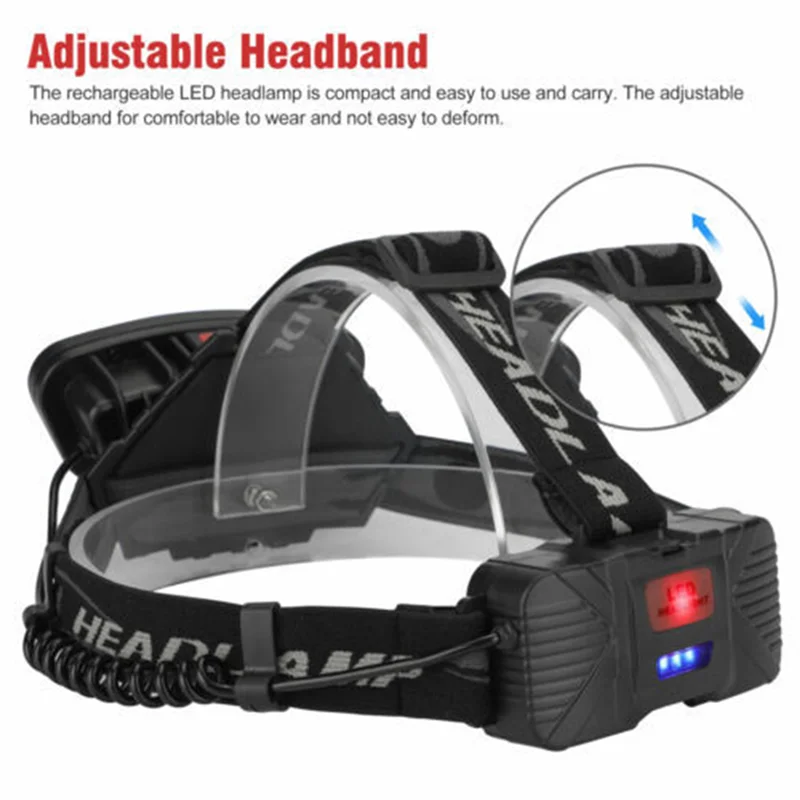 1, Adjustable Headband: The rechargeable LED headlight is compact and easy to use and carry. The adjustable headband for comfortable to wear and is not easy to deform.