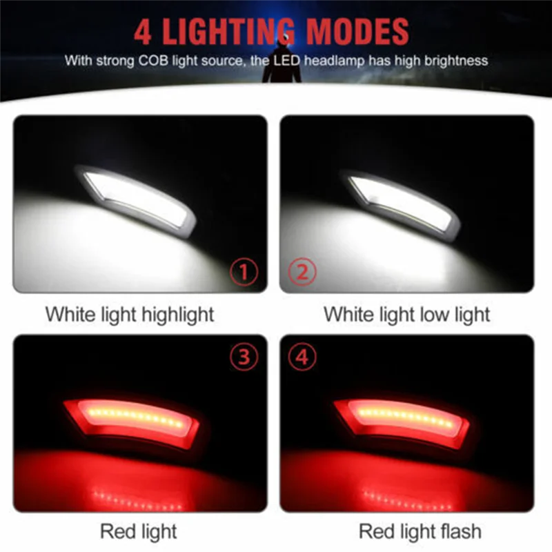 2.4 Lighting Modes: With strong COB light source, the LED head light lamp s has high brightness. There are 4 lighting modes: white highlight light, white light low light, red light and red flash light.